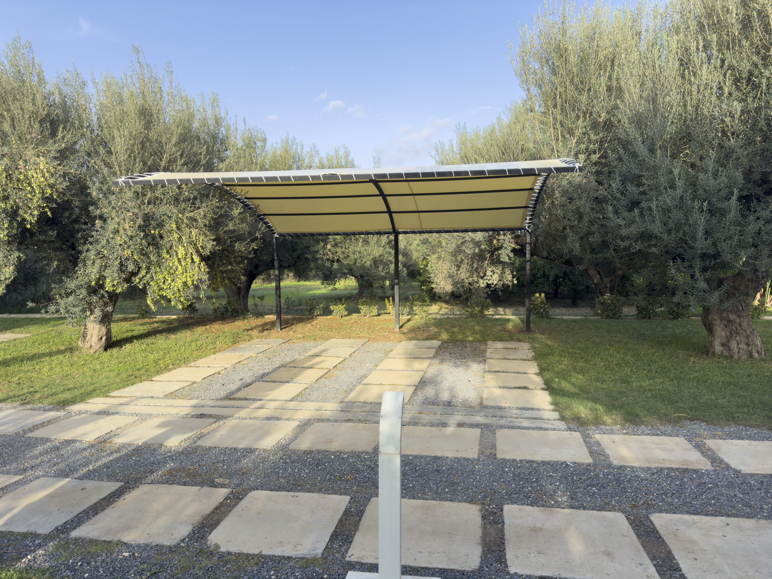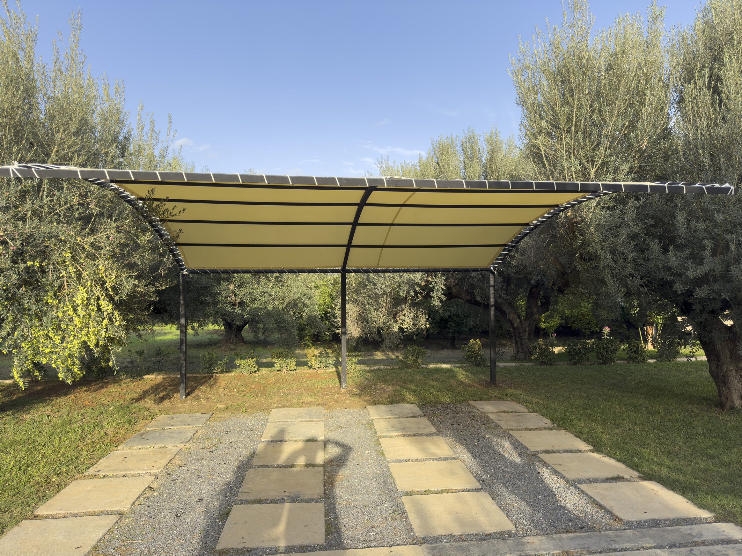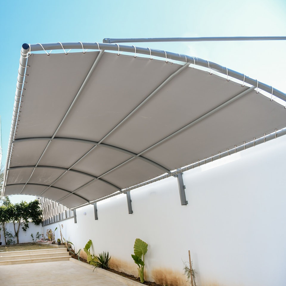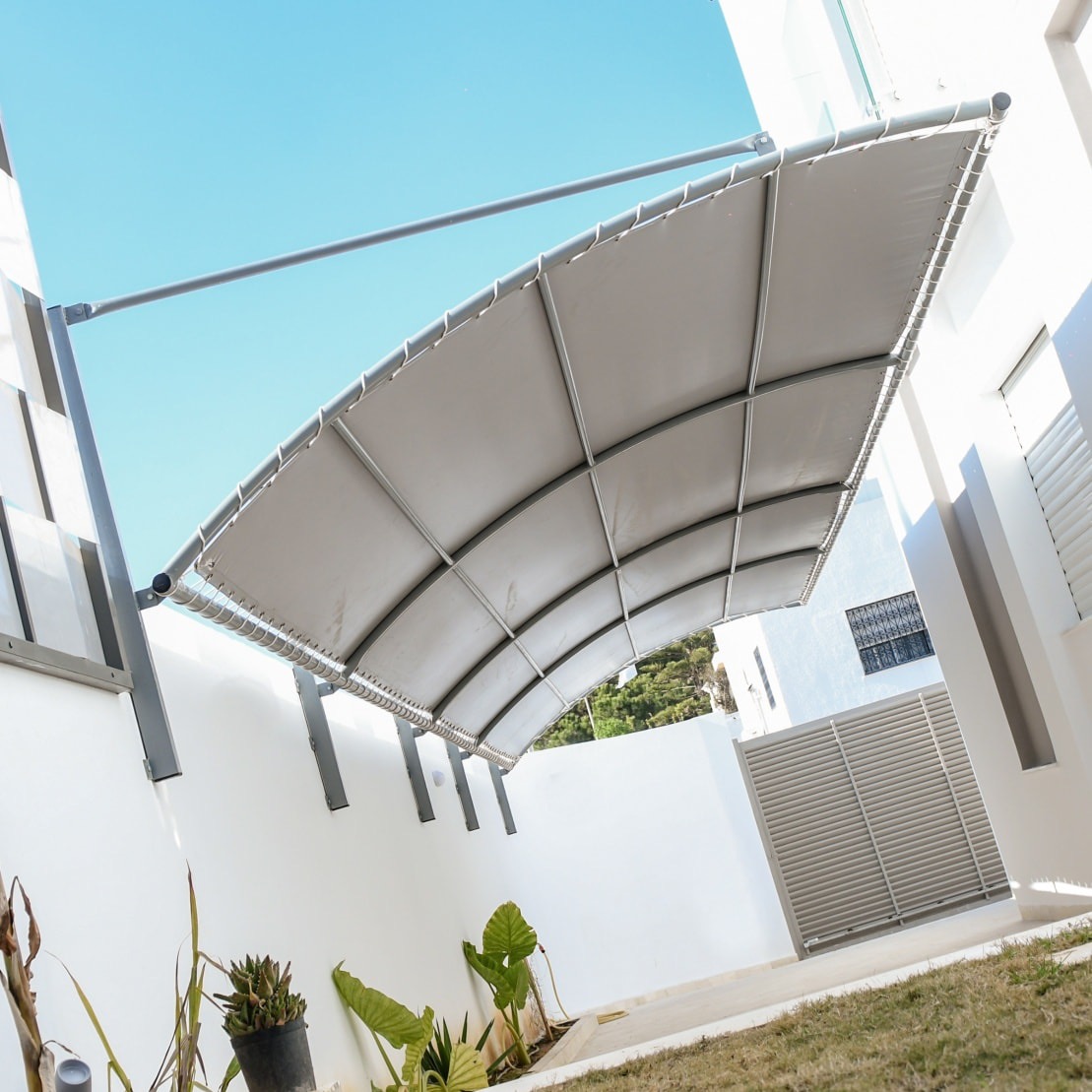 Structure suspendue en bois ou métal, offrant un abri original pour une entrée, une baie vitrée ou un espace détente.